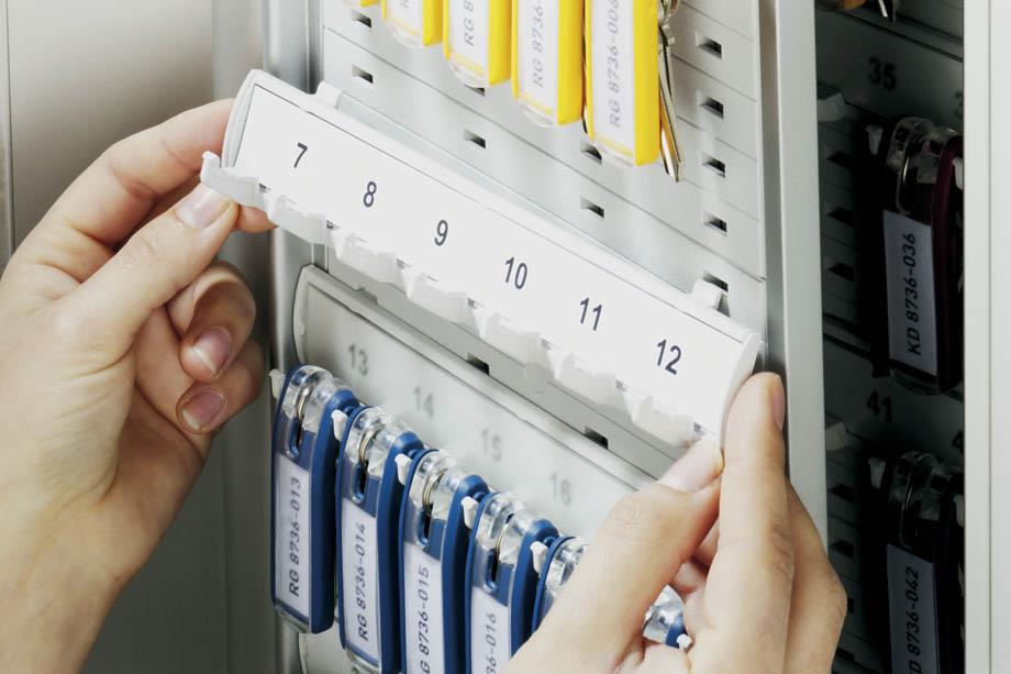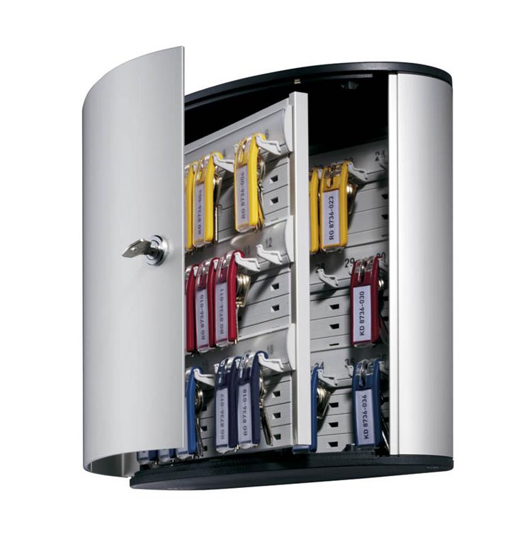 Elegantna stenska omarica za urejeno in pregledno shranjevanje ključev. Omarica je izdelana iz aluminija v kombinaciji z nezlomljivim poliamidom. Namenjena je pritrditvi na steno. Ima cilindrično ključavnico ter kljukice za pregledno obešanje ključev. Priloženih je šest obeskov za ključe Durable 1952 v sortiranih barvah.