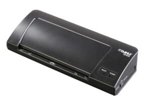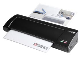 Aparat za plastificiranje DAHLE vam omogoča plastificiranje do formata A3 z žepki debeline največ 2×125 mic. Čas ogrevanja znaša 30 sekund, deluje s sistemom štirih silikonskih valjev in omogoča plastifikacijo v foto kvaliteti. Največja širina plastificiranega žepka je 325 mm.