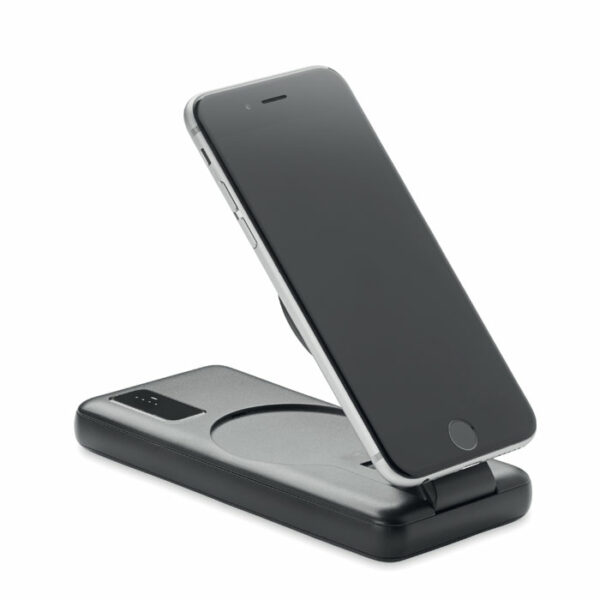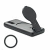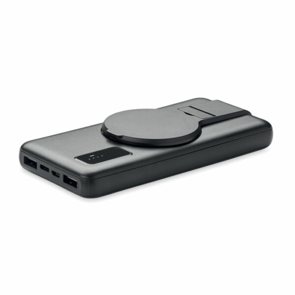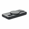 Magnetni brezžični polnilec (15 W), power bank (10000 mAh) iz ABS in magnetno stojalo za telefon. Vhod: micro B, Type-C. Izhod 2x USB-A In/Type-C/DC 9V/1,66A (15W) idealen za hitro polnjenje. Združljivo z iPhone® 12 in novejšimi. Vključuje dodatni magnetni kovinski obroč za podporo polnjenju nemagnetnih brezžičnih telefonov, ki jih je mogoče polniti. Podpora za napajanje (PD) za polnjenje najnovejšega prenosnika MacPro®.