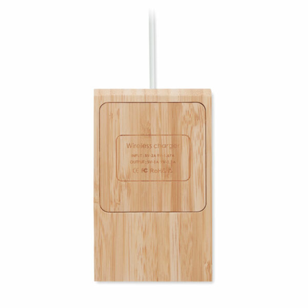10 W brezžični polnilnik iz bambusa s funkcijo stojala. Izhod: DC 9V/1,1A primeren za hitro polnjenje. Združljivo z najnovejšimi Androidi, iPhone® 8 in novejšimi.