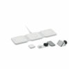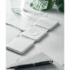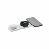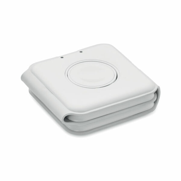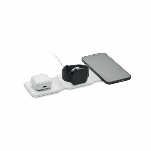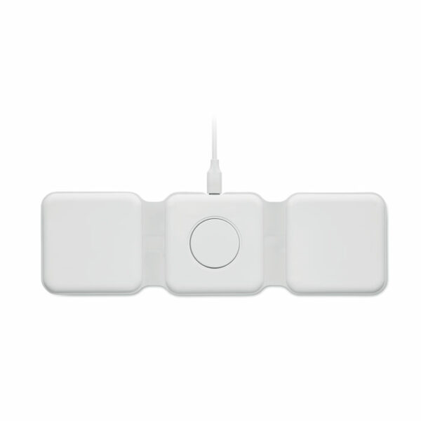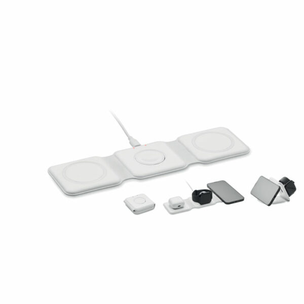 3 v 1 zložljiva polnilna postaja iz ABS. Ima 3 brezžične polnilne točke (15W). Vhod: 2-v-1 Type-C in Type-A. Združljiv z vsemi napravami, ki podpirajo QI, kot so najnovejši Androidi, iPhone® 8, X in novejši. Združljiv tudi z iWatch.