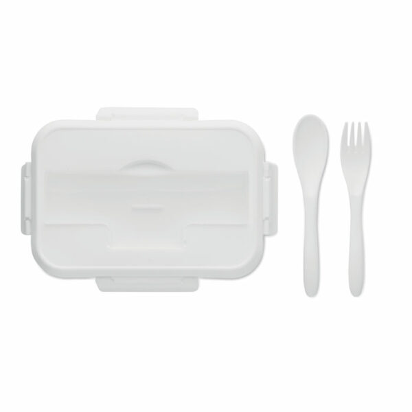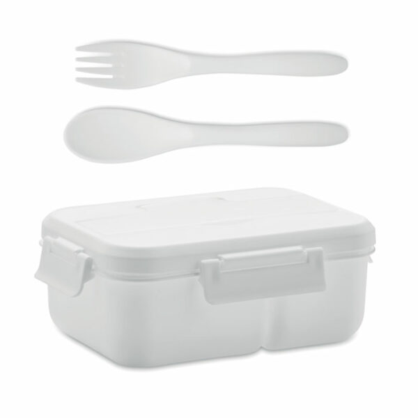 Posoda za malico iz PP z ujemajočim setom jedilnega pribora in ročajem.