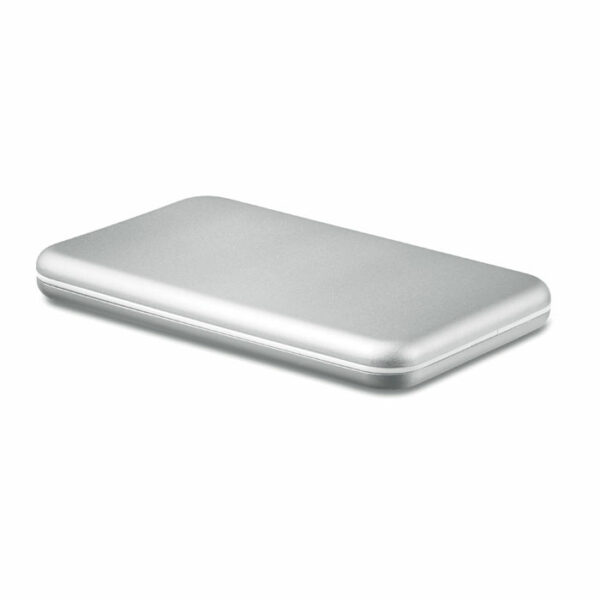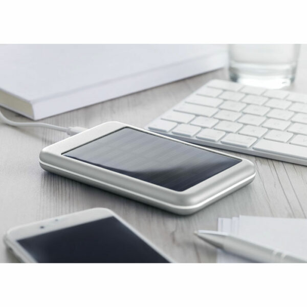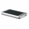 Power bank 4000 mAh iz aluminija in solarne polnilne plošče. Kapaciteta za uporabo pametnega telefona, izhodni tok DC5V/1A. Vključuje indikatorsko lučko in kabel USB z mikro usb vtičem.