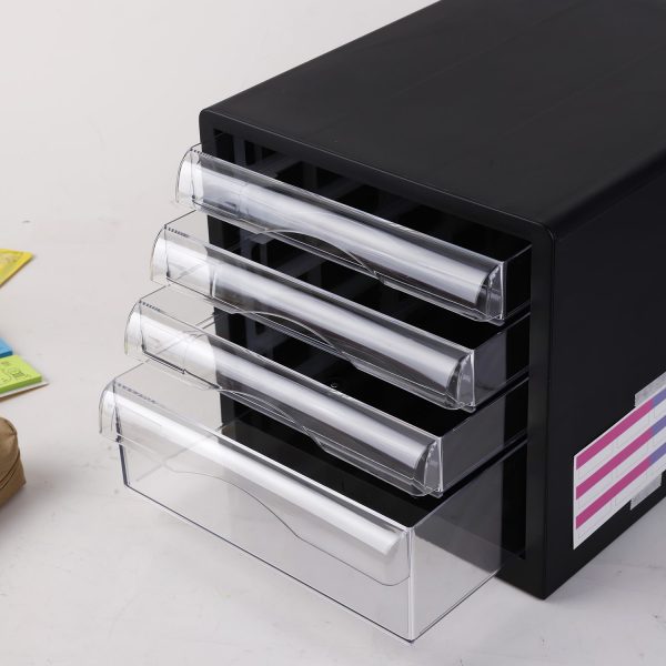 Atraktiven in inovativen namizni predalnik za vsako pisarno, izdelan iz kvalitetne plastike s štirimi zaprtimi predali za odlaganje dokumentov do formata C4. Predalniki se lahko zlagajo v višino in širino. Predali se odpirajo neslišno in imajo vgrajeno varovalo proti izpadanju iz ohišja. Priložene etikete z okenci za označevanje vsebine predalov.