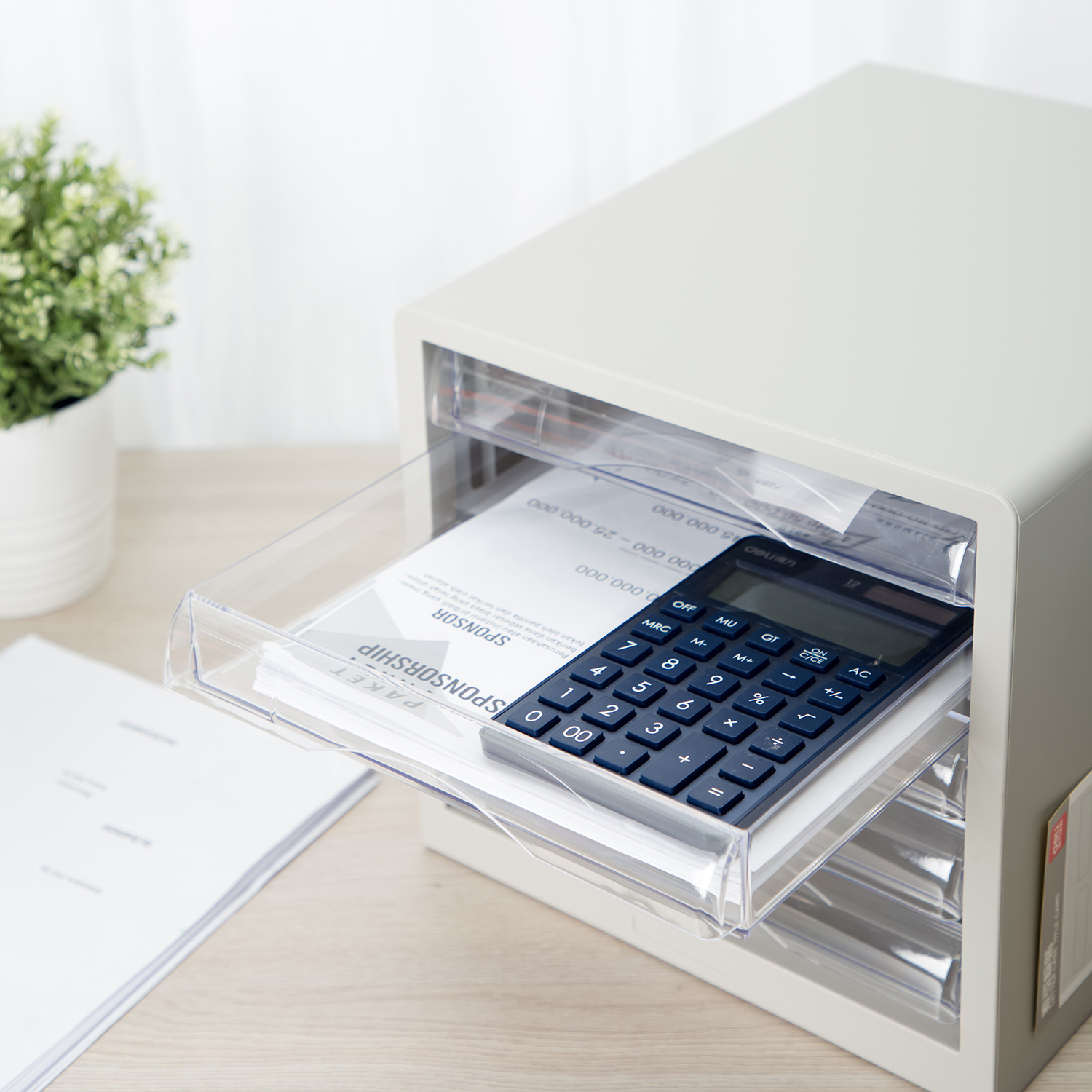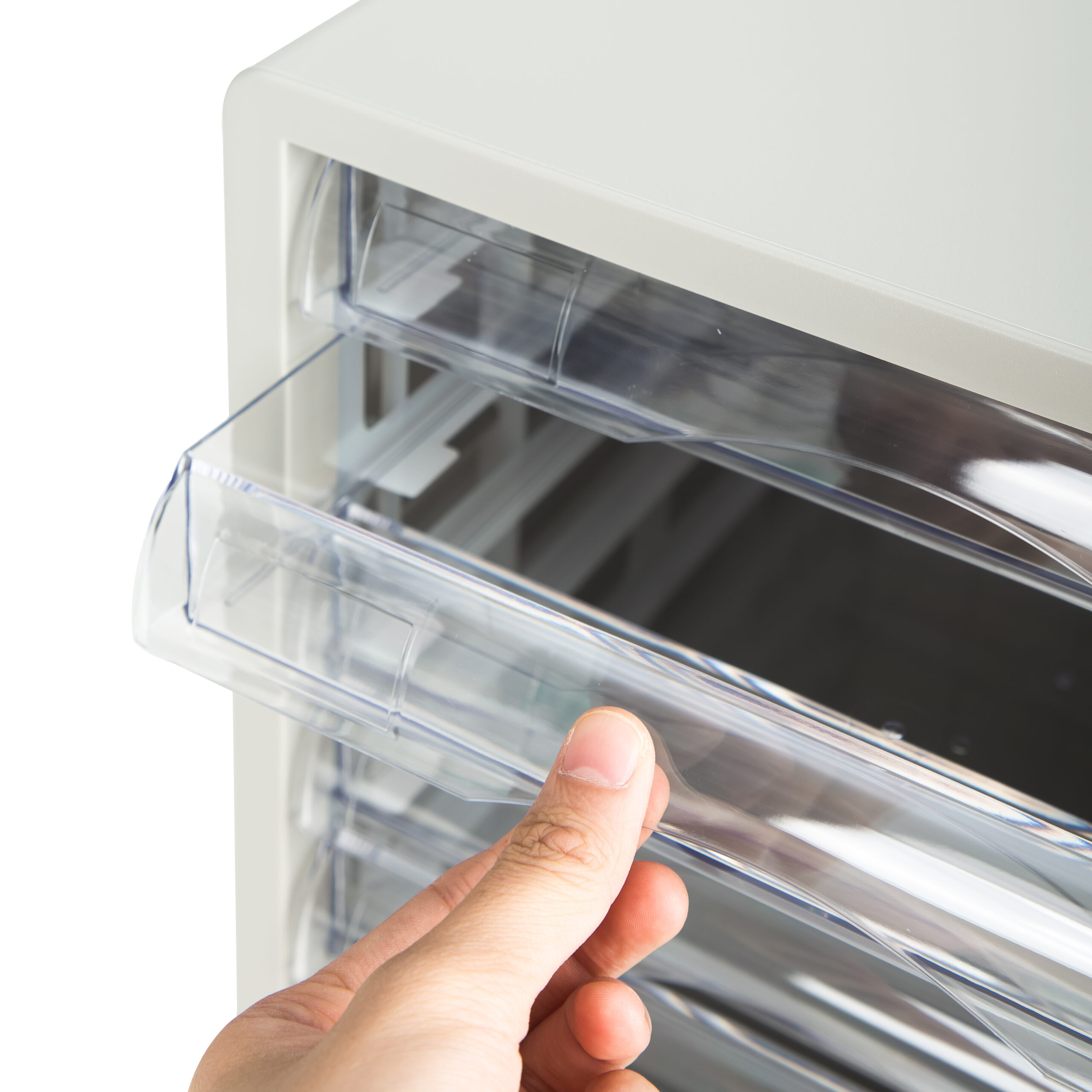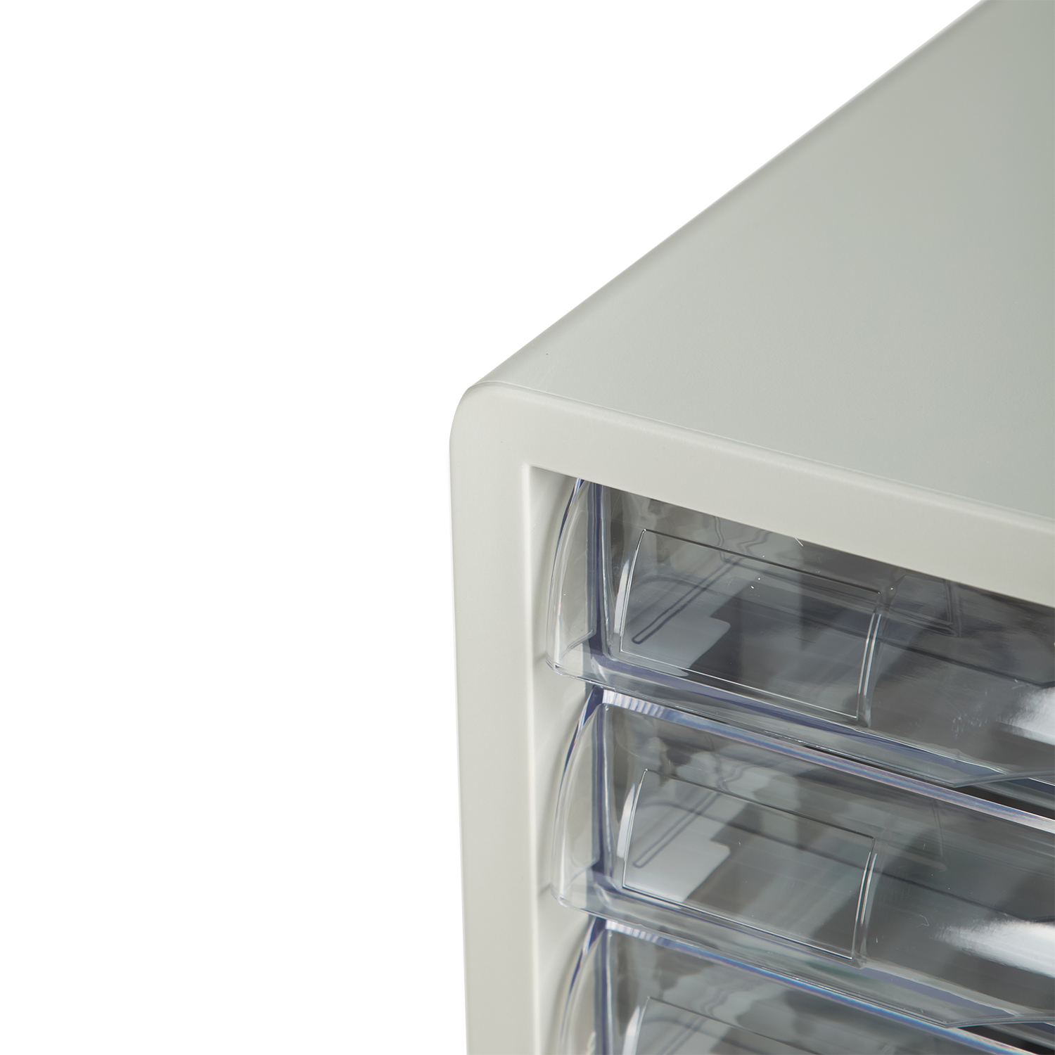 Atraktiven in inovativen namizni predalnik za vsako pisarno, izdelan iz kvalitetne plastike s štirimi zaprtimi predali za odlaganje dokumentov do formata C4. Predalniki se lahko zlagajo v višino in širino. Predali se odpirajo neslišno in imajo vgrajeno varovalo proti izpadanju iz ohišja. Priložene etikete z okenci za označevanje vsebine predalov.