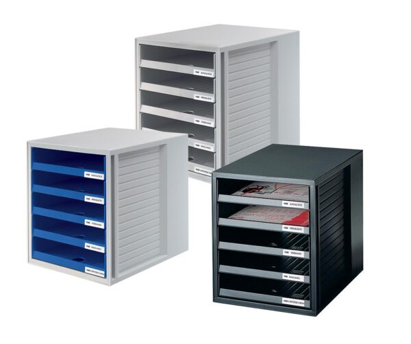 Klasičen namizni predalnik za vsako pisarno ali domačo uporabo. Izdelan je iz kvalitetne plastike s petimi odprtimi predali za odlaganje dokumentov do formata A4/C4. Predalniki se lahko zlagajo v višino in širino. Predali imajo vgrajeno varovalo proti izpadanju iz ohišja. Priloženi so vložni listki za označevanje vsebine predalov. Višina predalnika je enaka višini registratorja in je tako primerna za vstavljanje v pisarniške omare. Predalniku so priložene gumijaste nogice, da ne poškoduje površine pohištva.