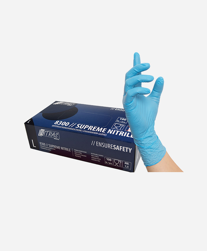 Profesionalne rokavice NITRAS SUPREME EXTRA STRONG za enkratno uporabo iz nitrila se zelo vzdržljive in odporne na predrtje in obrabo. Uporabljajo se v bolnišnicah, živilski industriji, kozmetiki, laboratorijih, industriji in kot zaščita pri čiščenju. Nitril material omogoča visoko občutljivost, spretnost in udobje. Kemična odpornost na detergente, ogljikovodike, topila, etri in freonom (TF). Dobra mehanska odpornost, ki je boljša od rokavic iz lateksa za enkratno uporabo. Primerne za stik z živili. Rokavice niso sterilne.