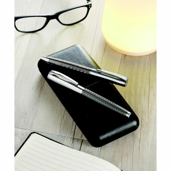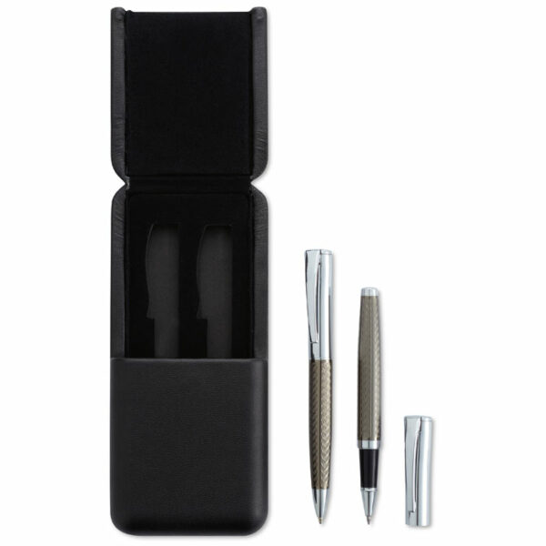 Darilni set s kemičnim svinčnikom in rolerjem pakirano v elegantni leseni darilni škatli.