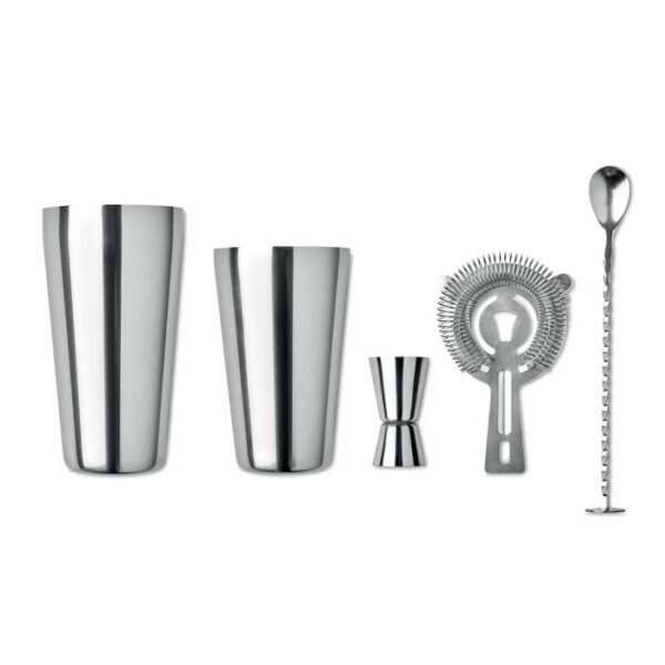 Set za koktajle iz nerjavečega jekla s 750 ml shakerjem, merilnim vrčem (30 ml), žlico za mešanje in sito/cedilo v bombažni vrečki.