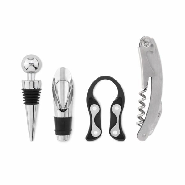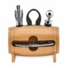 Leseno stojalo s štirimi dodatki za vino, vključuje: natakarski nož, zamašek za vino, točilnik vina z zamaškom in rezalnik folije.