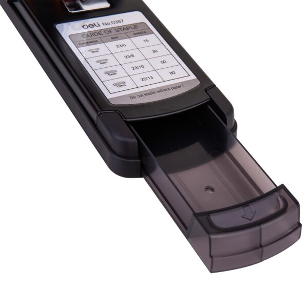 Praktičen eleganten spenjač s kovinskim ogrodjem in plastično prevleko za prijeten otip. Spenjač ima natančno enojno vodilo in kovinski zalogovnik za sponke, ki jih dodajamo z zgornje strani.