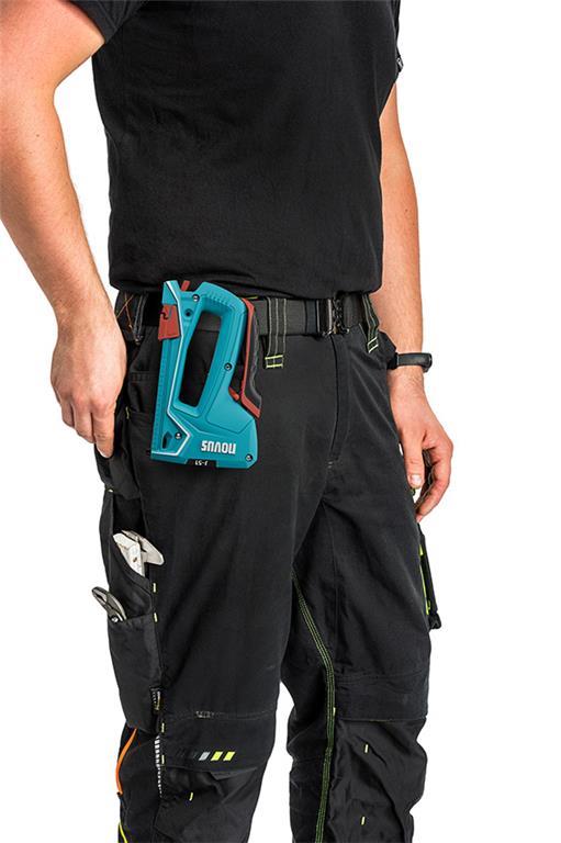 Močan profesionalni spenjač iz visokokakovostne ABS plastike spenjač z vzdržljivim ohišjem iz tlačno litega cinka za popolno pritrjevanje najrazličnejših plošč in okrasnih letev na gradbiščih in v delavnicah z ergonomsko ročica za lažje delo in možnim zaklopom ročice. Sistem za hitro vstavljanje sponk na spodnjem delu z varnostnim zaklopom in dober pregled nad zalogo sponk. Distančnik omogoča spenjanje paralelno na isti razdalji, dolga šoba za natančno pritrjevanje na težko dostopnih mestih, trdna zaponka za pripenjanje za pas na delovnih oblačilih. Mehanizem za polnjenje sponk na spodnjem delu z varnostnim zaklepom in hitrim polnjenjem; vsi deli so trdno vgrajeni in jih ne morete izgubiti, zagotavlja pravo udarno silo za vsako delo, na mehkem ali trdem lesu, zaradi mehanske nastavitve udarne sile. Primeren za materiale: izdelki z aluminijasto laminacijo, plošče iz plute (2–10 mm), dekorativne/kotne letve, trde plošče (2-6 mm), izolacijski materiali (steklena volna), usnje/umetno usnje, papir/karton, filc, rjuhe, tanki leseni stebri, voskani/oljeni papirji, zaščitni trakovi. Za natančne rezultate je sprednji del spenjača oblikovan tako, da je vidno, kje sponke izhajajo.