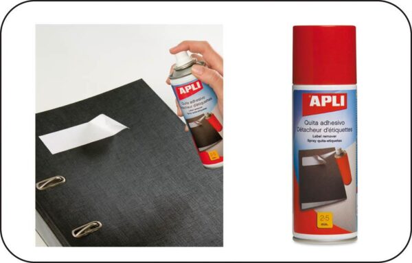 Sprej za odstranjevanje nalepk Apli, za učinkovit način odstranjevanja nalepk s stekla, map in plastike. Uporaba: nanesite sprej na nalepko, kjer naj deluje nekaj minut, preden začnete z odstranjevanjem
