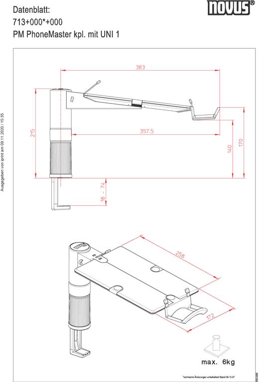 Vrtljiva roka za telefon z dosegom stojala v širino 383 mm, v višino 140 mm. Univerzalni vpenjalnik za mizo debeline od 18-74 mm. Roka se lahko vrti v krogu 360°, velikost plošče 258 x 172 mm.