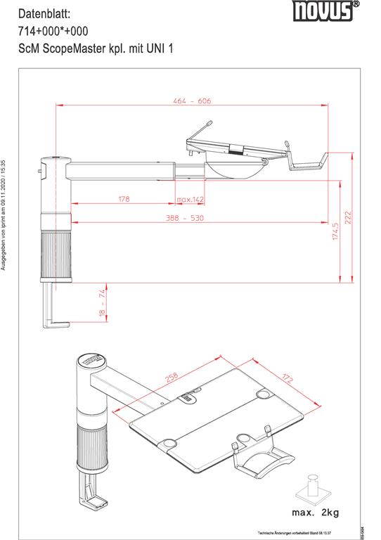 Vrtljiva roka za telefon z dosegom stojala v širino 464-606 mm, v višino 175mm. Univerzalni vpenjalnik za mizo debeline od 18-74 mm. Roka se lahko vrti v krogu 360°, velikost plošče 258 x 172 mm.