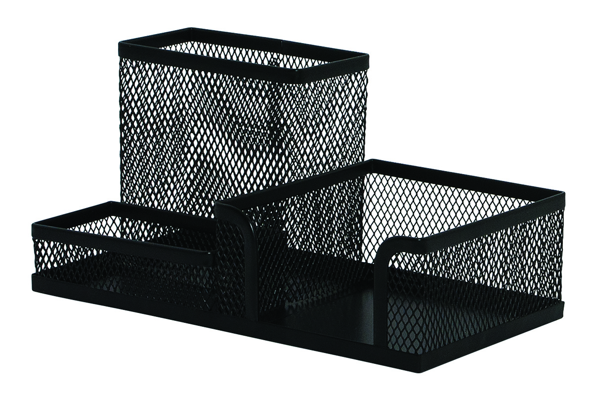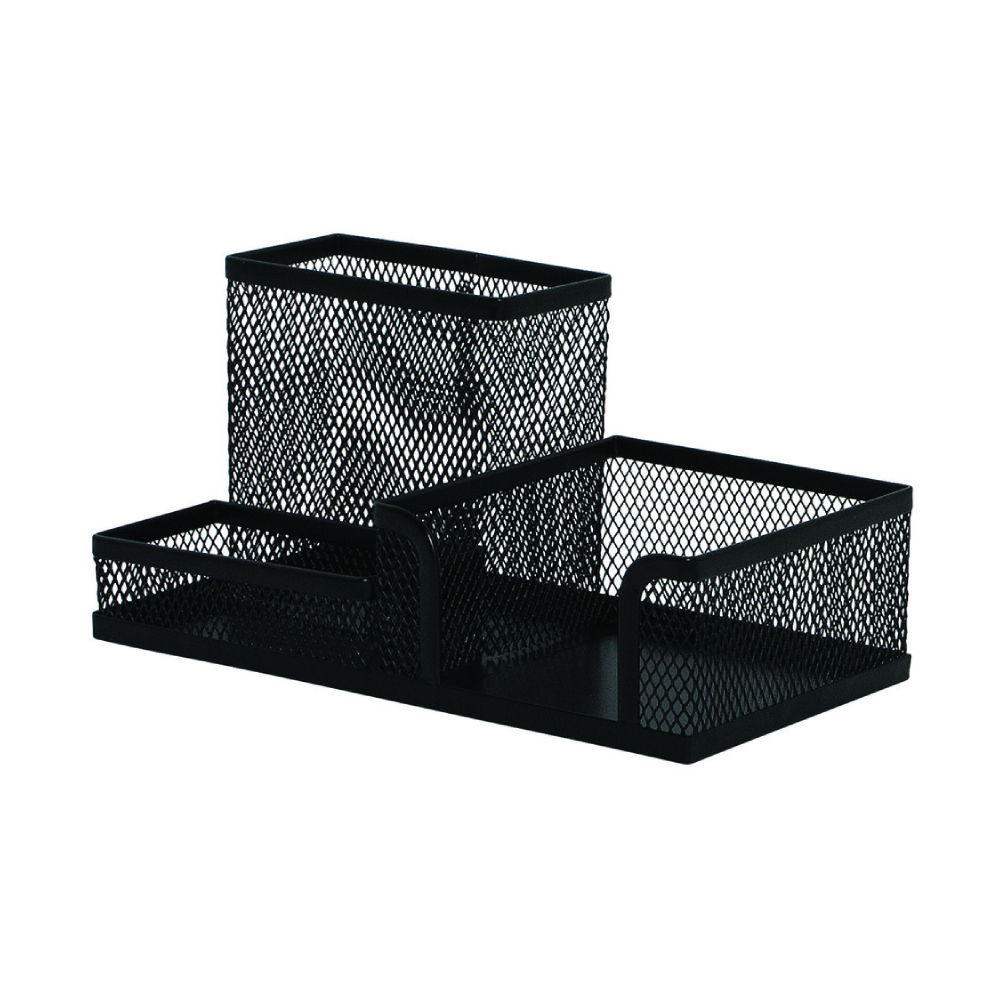 Elegantno stojalo za shranjevanje svinčnikov, listkov, vizitk, sponk in drugih drobnarij. Lonček je izdelan iz trpežne kovinske žice in ima tri razdelke za pregledno odlaganje.