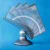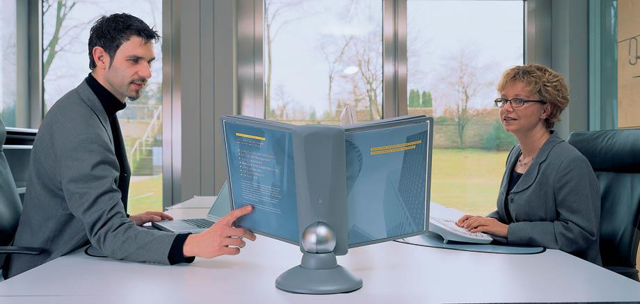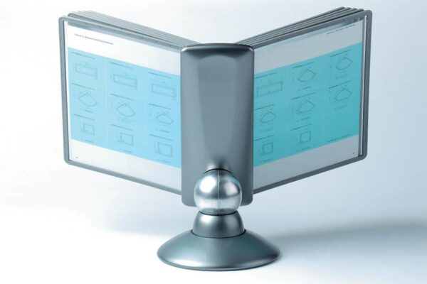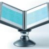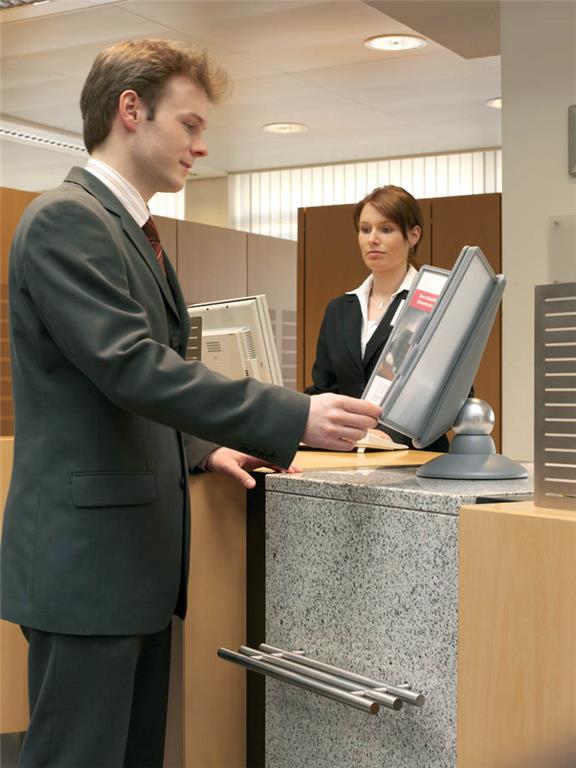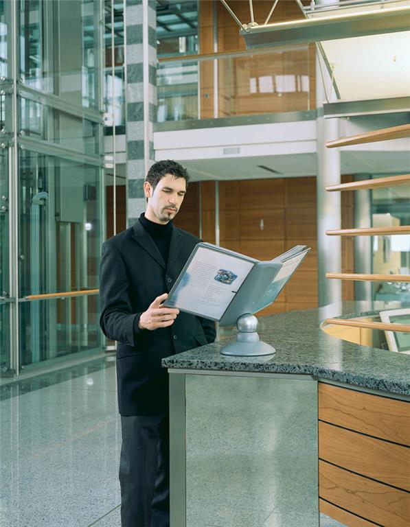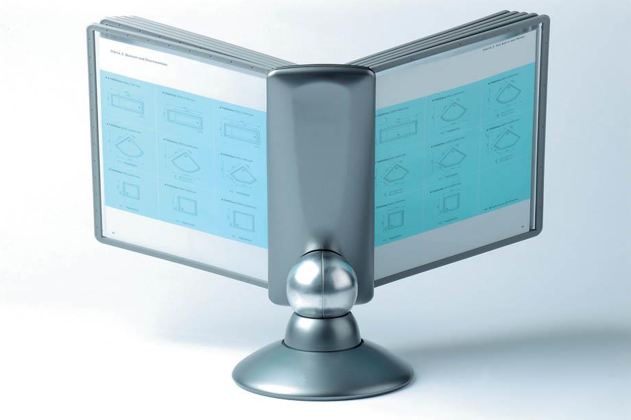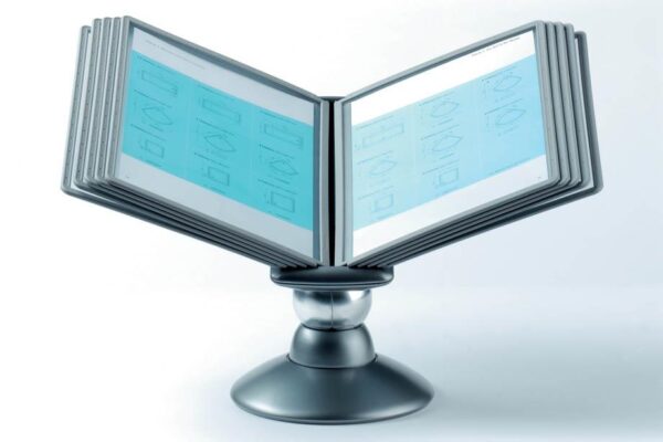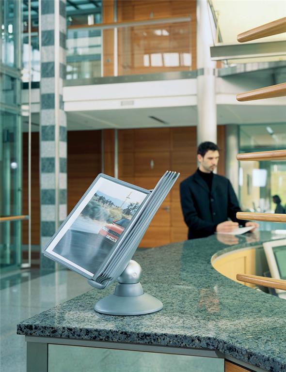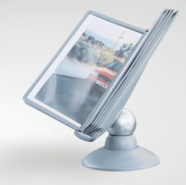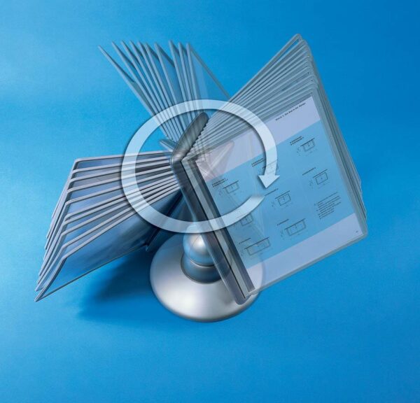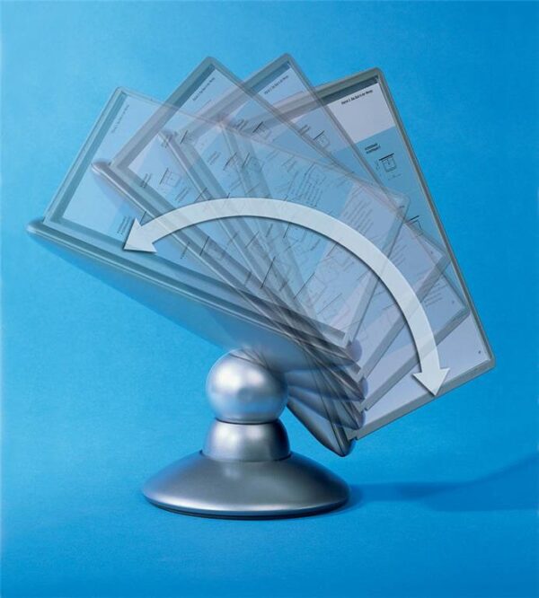 Praktično namizno vrteče stojalo Durable Sherpa omogoča hiter in pregleden dostop do tiskanih informacij, ki jih želimo predstaviti ali uporabljati. Idealno je za uporabo v manjših pisarnah. Vanj lahko vlagamo prospekte, cenike, telefonske številke, informacije o izdelkih itd. . Izdelano je iz kvalitene trpežne plastike, stabilnost pa zagotavlja robustna noga. Galvanizirana kovinska krogla omogoča vrtenje stojala za 360° ter nastavitev bralnega naklona od 25º do 75º. Vložene predstavitvene mape formata A4 ščitijo dokumente pred umazanijo in omogočajo enostavno menjavo vloženih dokumentov. Okvir mape je izdelan iz trde trpežne plastike notranjost pa iz mat prozorne polipropilenske folije. Nesvetleča mat folija omogoča fotokopiranje ali skeniranje dokumenta, ne da bi ga vzeli iz mape.Stojalo je namenjeno za vstavljanje do 10 predstavitvenih map Durable 5606 ali 5607. Priloženih je 10 predstavitvenih map ter označevalcev v črni barvi.