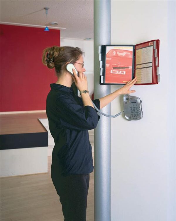Stenski nosilec predstavitvenih map Durable Sherpa omogoča hiter in pregleden dostop do tiskanih informacij, ki jih želimo predstaviti. Idealen je za uporabo v recepcijah, bankah, skladiščih, proizvodnji, pisarnah, prodajnih salonih, potovalnih agencijah in drugih prostorih kjer želimo posredovati informacije. Izdelan je iz trpežne plastike, pribor za montažo na steno je priložen. Vložene predstavitvene mape formata A4 ščitijo dokumente pred umazanijo in omogočajo enostavno menjavo vloženih dokumentov. Nosilec je namenjen za vstavljanje do 10 predstavitvenih map Durable 5606 ali 5607. Priloženih je 10 predstavitvenih map (5 x črna in 5 x rdeča)