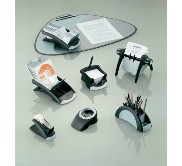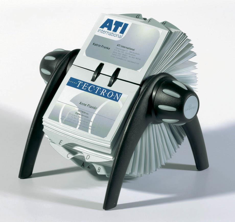 Vrtljivo stojalo za shranjevanje vizitk. Ob straneh sta ergonomsko oblikovana gumba za vrtenje kartic. Obojestranski vložni žepki so dimenzije 104 x 72 mm in se enostavno vstavijo in izvlečejo. Vrtljivi mehanizem poskrbi, da žepki med vrtenjem in pregledovanjem ostanejo na svojem mestu. Dodanih je 25 ločilnih kartic s črkami od A – Z. V stojalu je že 200 obojestranskih žepkov za shranjevanje do 400 vizitk, lahko pa se vstavi dodatne kartice ali vložne žepke za vizitke.