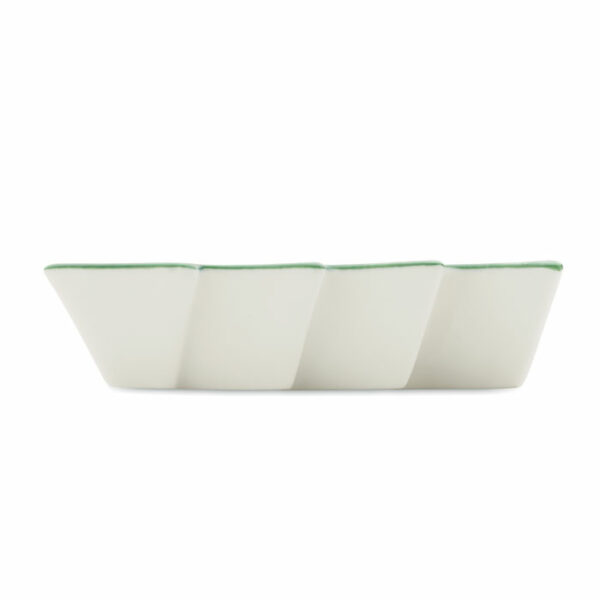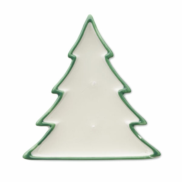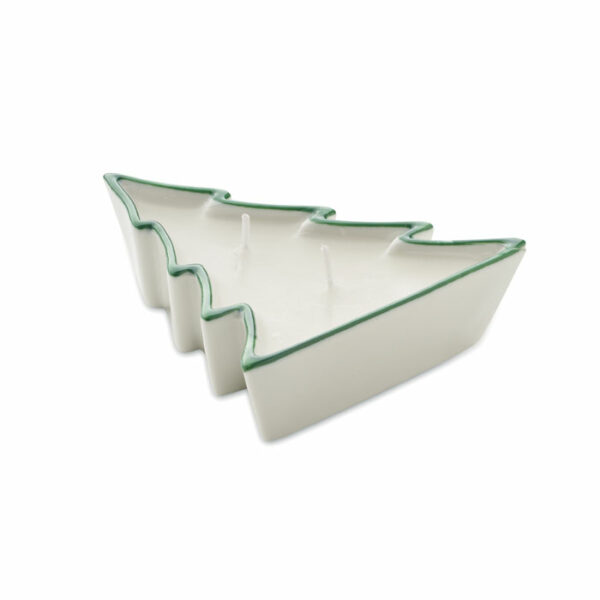 Sveča iz rastlinskega voska v porcelanastem držalu v obliki božičnega drevesa z dvema stenjema.