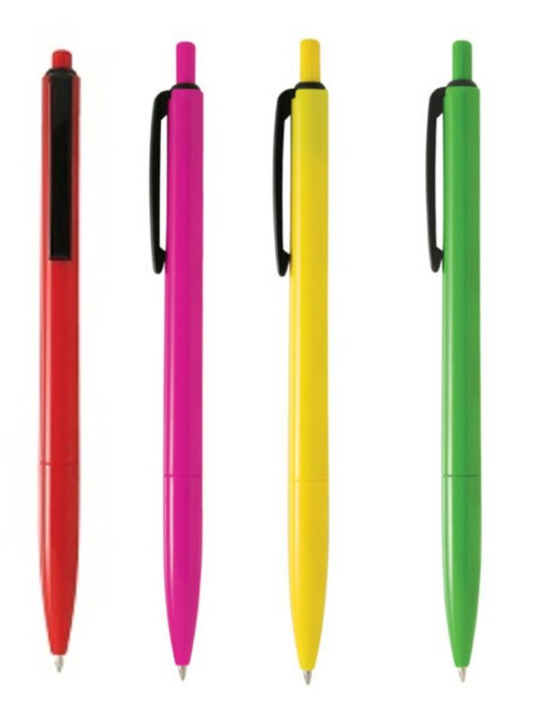 Kvalitetni cenovno ugodni kemični svinčniki s plastično sponko, plastičnim ohišjem in potisnim mehanizmom za vsakdanjo rabo.