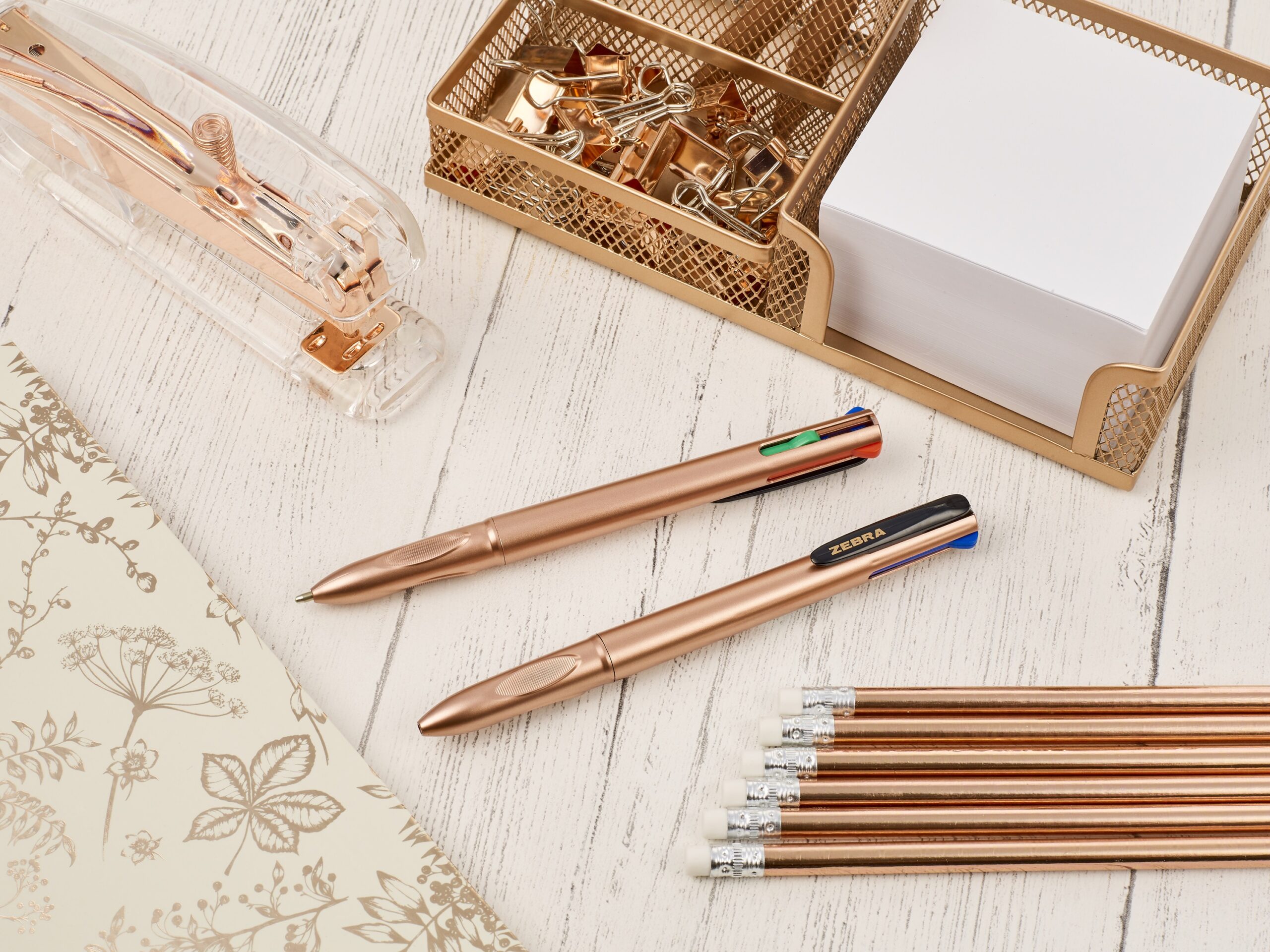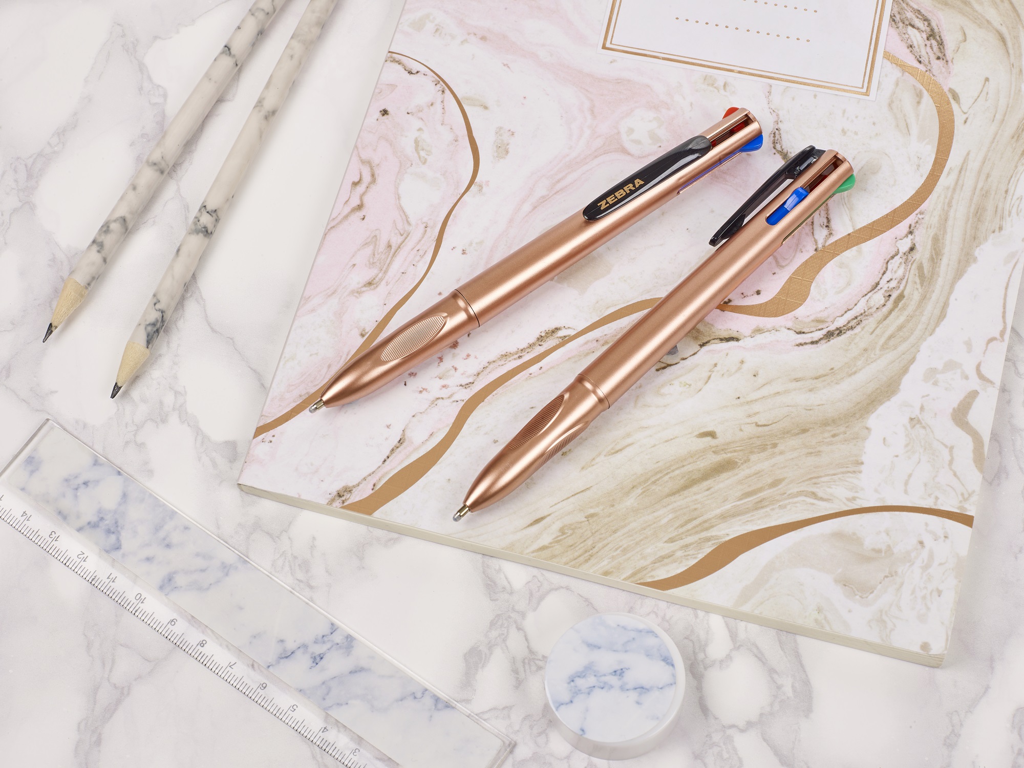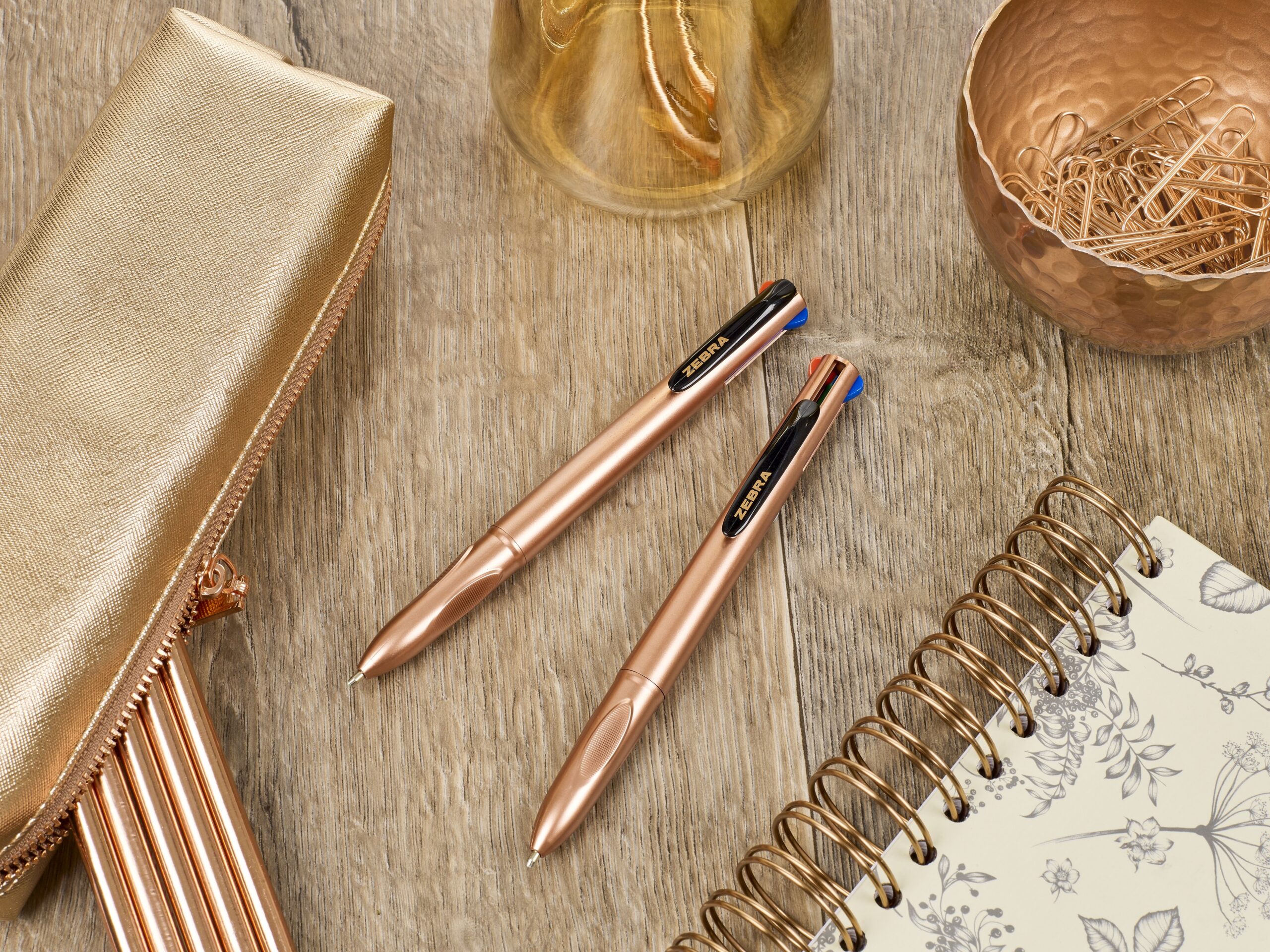 Kemični svinčnik s 4 barvnimi vložki, v modri, rdeči, črni in zeleni. Ohišje v rose gold odtenku.
