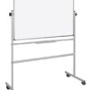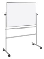 Samostoječa vrtljiva magnetna tabla z dvostransko belo lakirano površino in aluminijastim okvirjem. Robustno stojalo s štirimi kolesci in zavoro omogoča poljubno in lahkotno premikanje table. Tablo lahko obračamo za 360º, tako da omogoča enostavno uporabo obeh pisalnih površin.