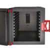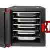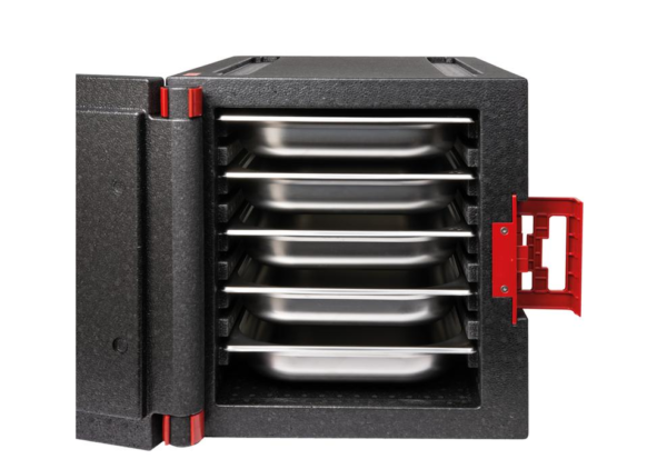 Izvedba z vratmi spredaj omogoča enostavno nalaganje posod eno na drugo, z ustreznimi vodili pa poskrbi za njihovo stabilnost – kapaciteta: 9 vstavnih vodil za GN posode 1/1, 1/2 ali 1/3, vsako 38mm narazen.
