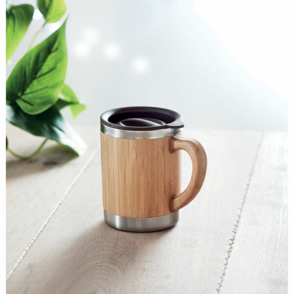 Termovka iz nerjavečega jekla z ohišjem iz bambusa in premično odprtino za pijačo.