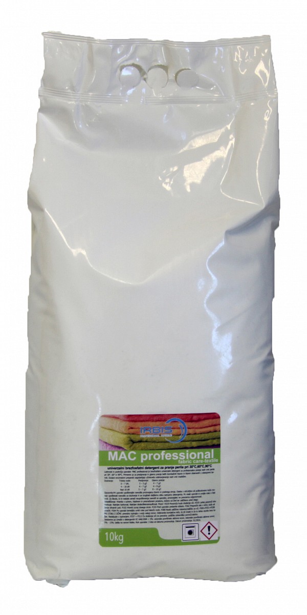MAC professional je brezfosfatni univerzalni detergent za profesionalno pranje vseh vrst perila pri 30°, 60° in 90°C. Primeren je za predpranje in glavno pranje belih bombažnih tkanin in tkanin obarvanih z obstojnimi barvili. Dodani encimskimi preparati zagotavljajo učinkovito odstranjevanje vseh vrst madežev.