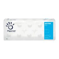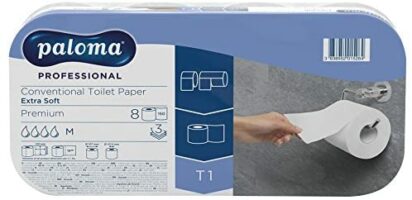 Bel dvoslojni toaletni papir/lističi izdelani iz čiste celuloze namenjeni uporabi v gospodinjstvu, industriji in drugih poslovnih prostorih.
