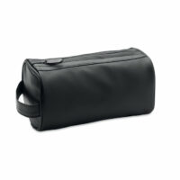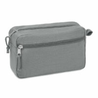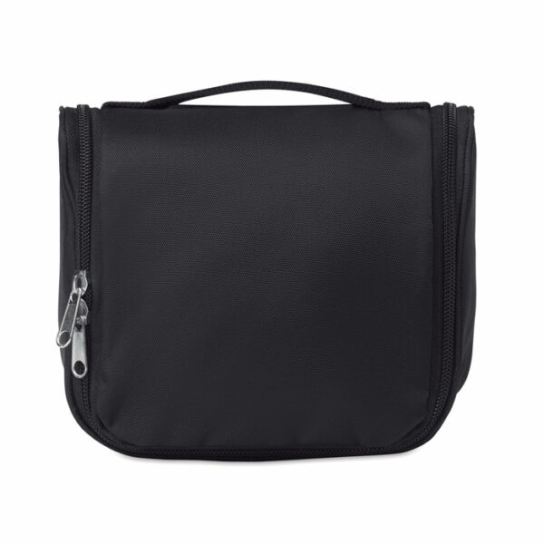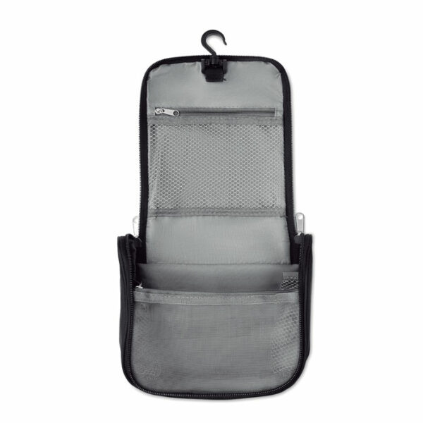 Viseča kozmetična torbica z več predelki in mrežastimi žepi, izdelana iz poliestra visoke gostote. Primerna za potovanja.