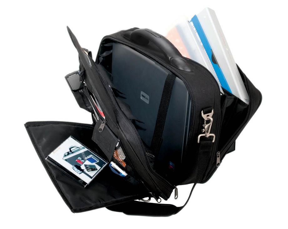 Praktična torbica izdelana iz poliestra za prenosne računalnike z zaslonom do 41 cm (16”) z obloženim osnovnim predalom za prenosnik in veliko drugimi žepki za drobnarije, za udobno prenašanje pa skrbi nastavljiv ramenski trak.