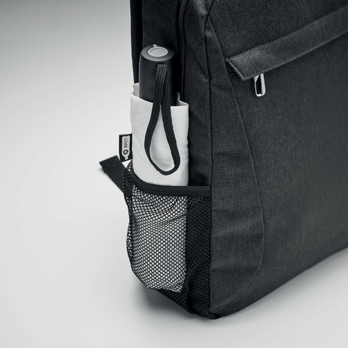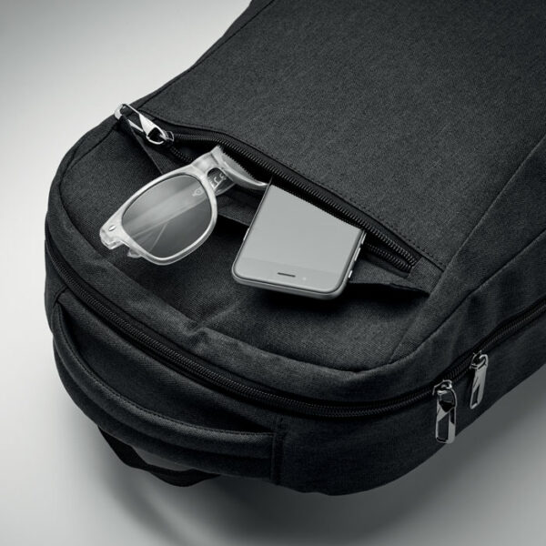 15-palčni nahrbtnik za prenosni računalnik. Notranji predal za prenosni računalnik in več majhnih notranjih predelkov. Ima sprednji žep z zadrgo in 2 stranska mrežasta žepa. Nastavljive naramnice.