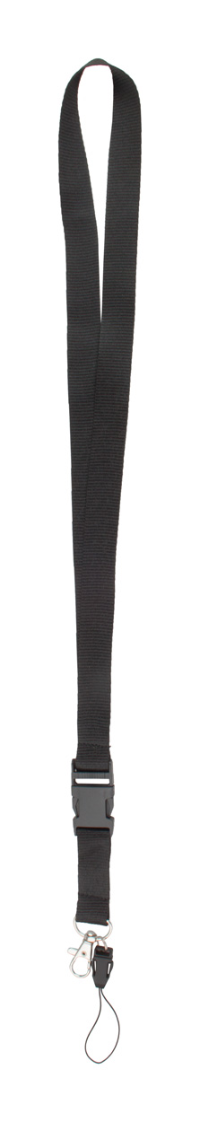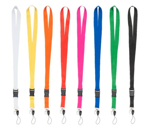 Poliesterski vratni trak s kovinskim karabinom, varnostno sponko in narebreno površino.