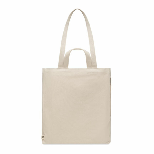 Vrečka nakupovalna iz recikliranega bombaža (70 % recikliranega bombaža, 30 % recikliranega poliestra) s kratkimi ročaji, s stranskim žepom z zadrgo.