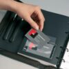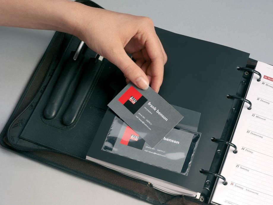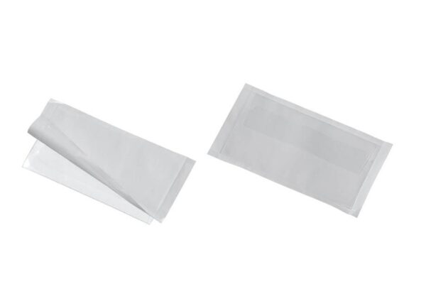 Samolepilni žepek iz PVC z zavihkom za zapiranje za shranjevanje in označevanje dokumentov, odprt na daljšem delu.