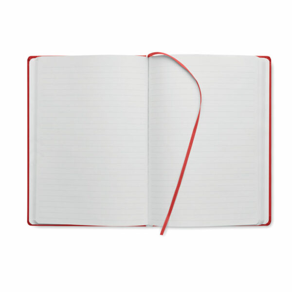 Zvezek A5 z elastiko in trdimi PU platnicami. 200 črtnih strani (100 listov) v recikliranem papirju. Na voljo trak, s katerim lahko spremljate vaše zadnje zapiske. Izdelano v EU.