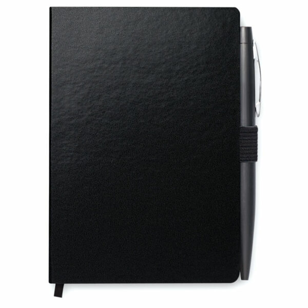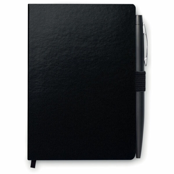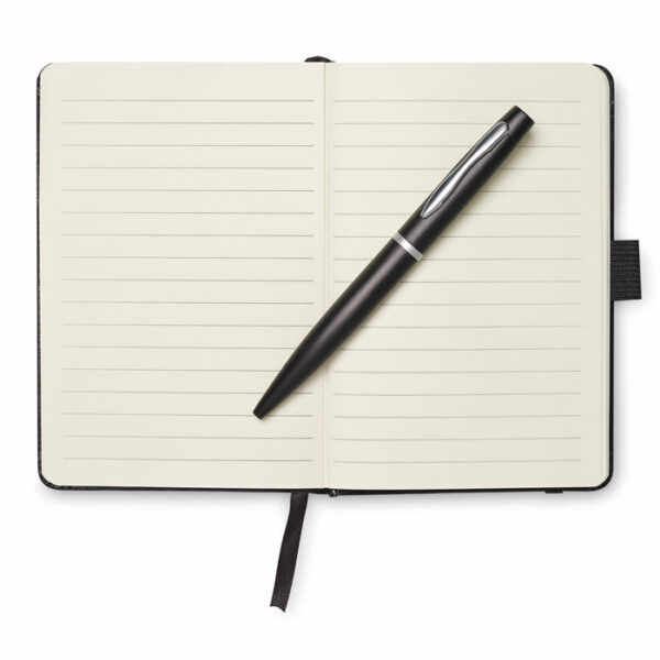 Set poslovni vsebuje, beležko A6 iz trdega PU s 144 črtnimi stranmi (72 listov). in ujemajoč kemični svinčnik s sponko, pritiskom na gumb. Na voljo trak, s katerim lahko spremljate vaše zadnje zapiske.