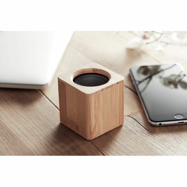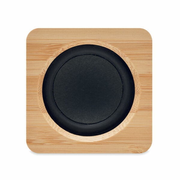 5.0 brezžični zvočnik z ohišjem iz bambusa in LED lučko. Kvadratna oblika z zaobljenimi robovi in leseno ohišje iz bambusa daje temu prenosnemu zvočniku moderen in naraven videz. Povežite svoj pametni telefon in prek zvočnika predvajajte svojo najljubšo glasbo. Ima polnilno litijevo 500 mAh baterijo, ki zadostuje za približno 4 ure predvajanja (pri 70 % glasnosti). Izhodni podatki: 3W, 3 Ohm in 5V.
